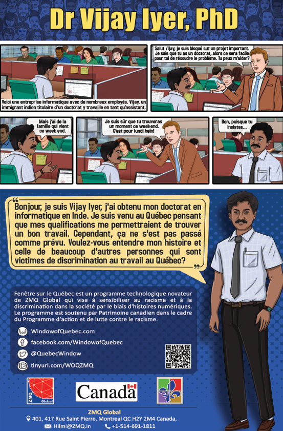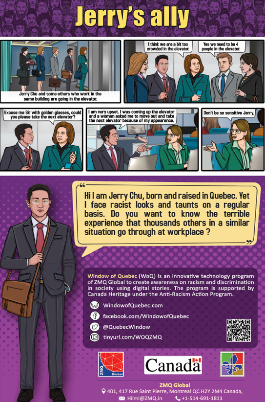 Window of Quebec (WoQ) is an innovative technology program of ZMQ Global to create awareness on racism and discrimination in society using digital stories. The program is supported by Canada Heritage under the Anti-Racism Action Program. The larger objective of the program is to uphold values of diversity and & inclusion, and confront racism & discrimination at various levels. The digital stories will be developed in English and French, and made available on mobile phones (App) and YouTube. The stories will be disseminated through multiple modes like corporates, public events and social media.